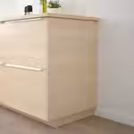 Матовые фасады кухонных шкафов УППЛЁВ бежевого цвета выполнены в утонченном современном стиле и дополнены скошенными краями и встроенными ручками в тон.