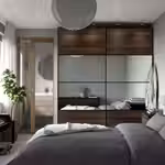 Эта пара раздвижных дверей выглядит стильно. Одна дверь — зеркальная, и в ней можно смотреть на себя в полный рост, а вторая состоит из панелей с разной отделкой с двух сторон, поэтому вы в любой момент