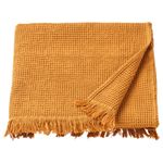 Темно-желтое вафельное полотенце из хлопка и вискозы хорошо впитывает влагу и быстро сохнет. Бахрома по краю придает ему интересную изюминку. Отлично сочетается по стилю и цвету с полотенцами ВИНАРН.