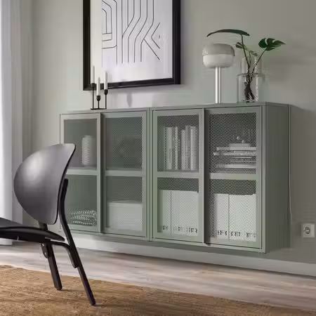 Светлая серо-бежевая дверь СИНДВИК с вставкой из прозрачного стекла идеально сочетается с фасадами ЛАППВИКЕН такого же цвета.