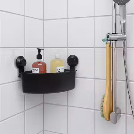 Такая полка позволит задействовать пустующий угол под хранение мыла и шампуней.
