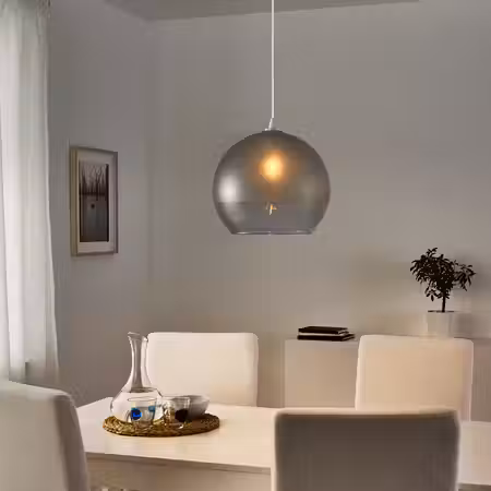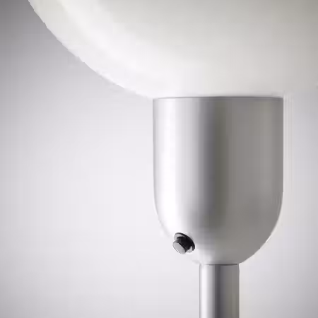 Глянцевый белый абажур направляет свет вверх, создавая мягкое рассеянное освещение и располагающую атмосферу в комнате.