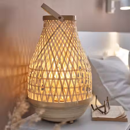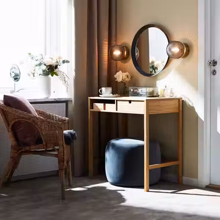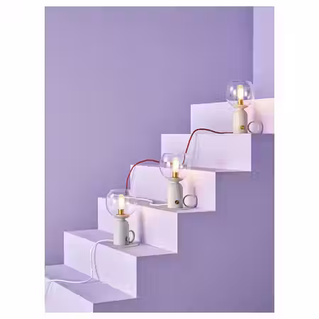 Светильники СОЛКЛИНТ, похожие на нежные украшения из золотистой латуни со сверкающим абажуром из серого стекла, дают мягкий атмосферный свет и создают на стенах и потолке красивую игру света и тени, где бы вы их ни включили.