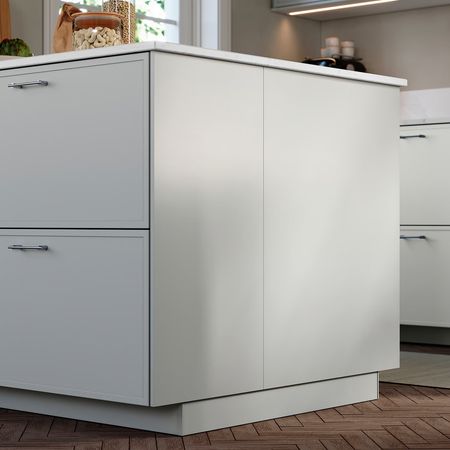 Классический дизайн дверцы БУДБИН мягкого серого тона подчеркнет традиционную выразительность кухни.