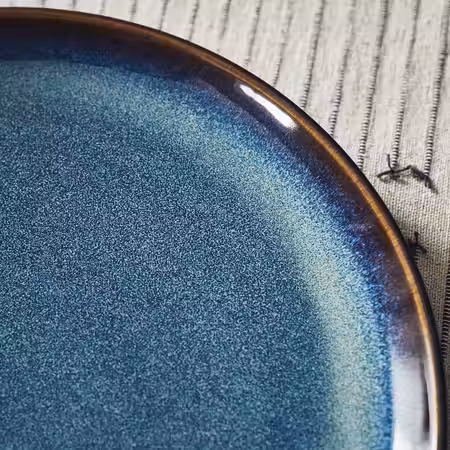 Глазурованная десертная тарелка насыщенного синего цвета с золотисто-коричневым ободком станет достойной оправой для ваших кулинарных шедевров.