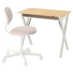 Столешница письменного стола BOLLPOJKE изготовлена из красивого светлого дерева, а под ней расположена открытая полка, где можно спрятать провода.