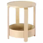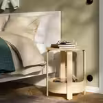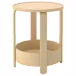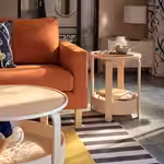 Круглая форма, легкость, гладкая поверхность и натуральные материалы позволяют использовать столик в интерьерах разных стилей.