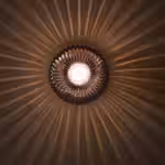 Благодаря таким материалам, как рисовая бумага и светлый березовый шпон, этот абажур смотрится очень естественно.