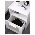 Прикроватная тумба БРИМНЭС с полкой для книг и выдвижным ящиком, в который можно спрятать зарядку и мобильные устройства, чтобы мерцающий свет не мешал вам спать.