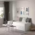В тесном пространстве не обойтись без продуманных решений для хранения. Серия БРИМНЭС — это умные решения для хранения и современный дизайн. Каркас кушетки с отделением для хранения, прикроватная тумба и комод — все необходимое для обустройства