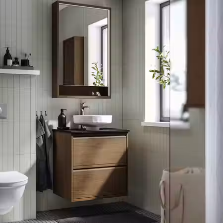 Мебель для ванной ЭНГШЁН выглядит современно и лаконично с минимумом деталей.
