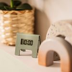 Компактный будильник КУПОН серо-зеленого цвета удобно поставить на прикроватную тумбочку и взять с собой в поездку.