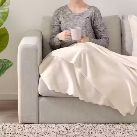 Очень мягкий и простой в уходе бежевый плед изготовлен из переработанного полиэстера.
