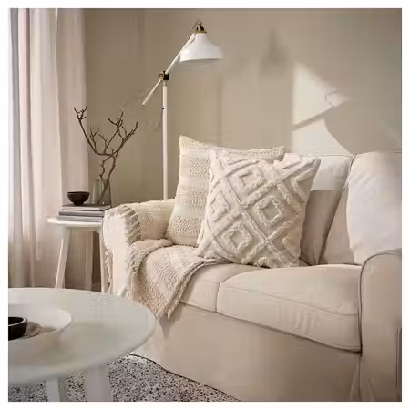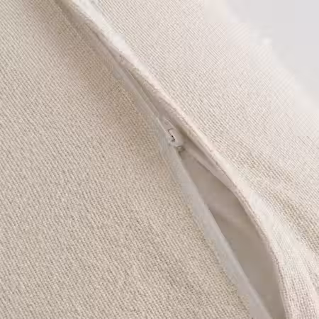 Крошечные белые петли образуют геометрический узор на этом чехле для подушки натурального цвета в стиле бохо.