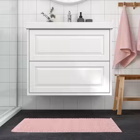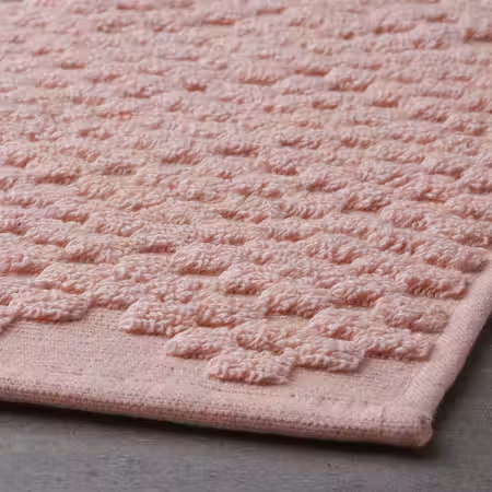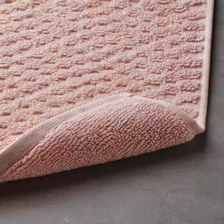 Бедно-розовый коврик для ванной ФЬЕЛЛЬКАТТФОТ с комфортной для ног фактурной поверхностью жаккардового плетения.
