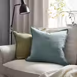 Чехол на подушку ЛАГЕРПОППЭЛЬ серо-зеленого цвета с текстурированной поверхностью, матовым блеском и окантовкой, которая подчеркивает стиль и сохраняет форму подушки.