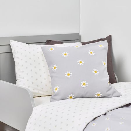 Этот уютный чехол на подушку будет круглый год напоминать вам о лете. С одной стороны его украшает вышивка, а с другой — печатный рисунок в виде симпатичных ромашек. Ткань сделана из хлопка, произведенного с заботой о