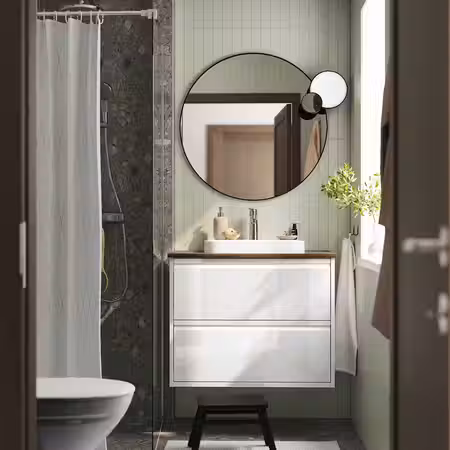 Мебель для ванной ЭНГШЁН выглядит современно и лаконично с минимумом деталей.