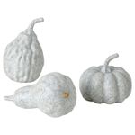 В набор входит 1 декоративная тыква (высота 13 см, диаметр 7 см), 1 декоративная тыква (высота 9 см, диаметр 9 см) и 1 декоративная тыква (высота 13 см, диаметр 8 см).