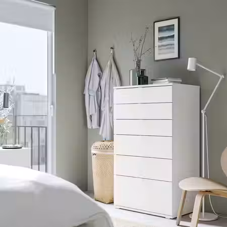 Все товары для хранения серии ВИХАЛС выполнены в едином стиле, что позволяет создать визуальную связь между разными комнатами дома. Этот комод также оснащен нашей инновационной функцией фиксации и разблокировки, которая снижает риск опрокидывания.
