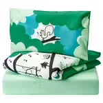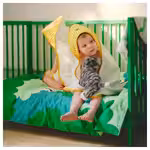 В комплект входит: 1 пододеяльник (110x 125 см), 1 наволочка (35x 55 см) и 1 натяжная простыня для матраса 60x 120 см высотой макс. 11 см.