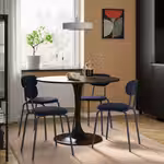 Круглый стол с плавными линиями создает в комнате располагающую атмосферу.