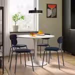 Круглый стол с плавными линиями создает в комнате располагающую атмосферу.