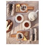 Прочная деревянная поверхность. Ножи не затупляются. Разделочную доску также можно использовать как поднос для подачи на стол сыров или мясной нарезки. Благодаря отверстию на ручке удобно вешать. Вымойте изделие перед первым использованием.