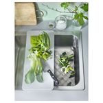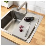 Благодаря пластиковым накладкам с обратной стороны доска лежит ровно и не скользит. Разделочную доску можно положить на раковину, чтобы получить дополнительная рабочая поверхность или спрятать грязную посуду.