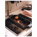 Этот дуршлаг устанавливается на мойку, что позволяет использовать его для мытья овощей и фруктов, в качестве посудной сушилки или для хранения аксессуаров для мытья посуды.