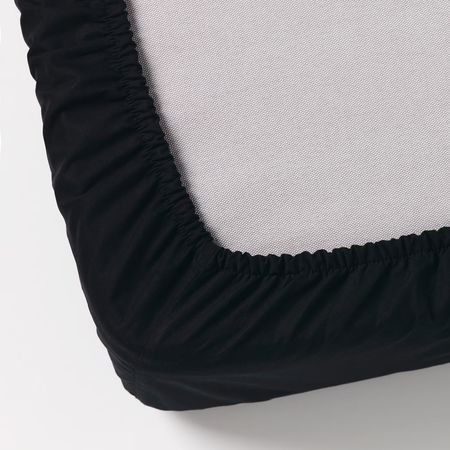 Натяжная серо-зеленая простыня ДВАЛА изготовлена из дышащей и поглощающей влагу хлопковой ткани, что обеспечивает ровную и комфортную температуру в течение всей ночи.