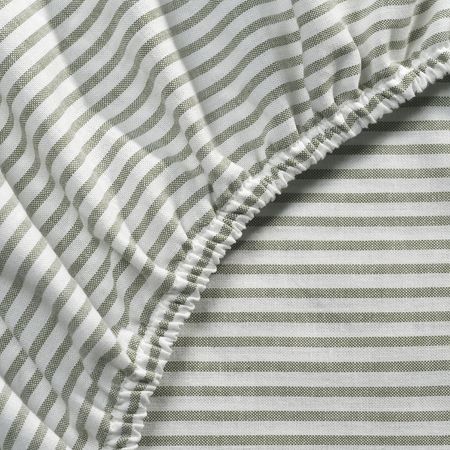 Натяжная серо-зеленая простыня ДВАЛА изготовлена из дышащей и поглощающей влагу хлопковой ткани, что обеспечивает ровную и комфортную температуру в течение всей ночи.