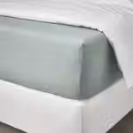 Натяжная серо-зеленая простыня ДВАЛА изготовлена из дышащей и поглощающей влагу хлопковой ткани, что обеспечивает ровную и комфортную температуру в течение всей ночи.