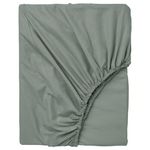 Натяжная серо-зеленая простыня ДВАЛА изготовлена из дышащей и поглощающей влагу хлопковой ткани, что обеспечивает ровную и комфортную температуру в течение всей ночи.