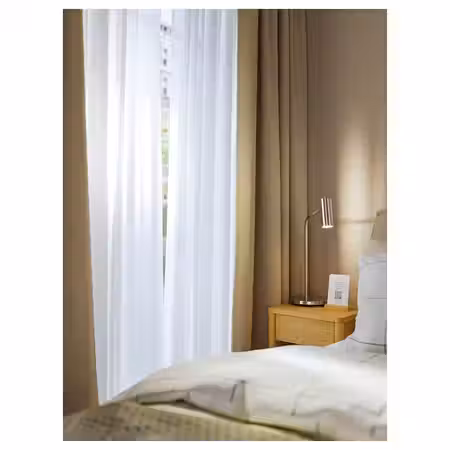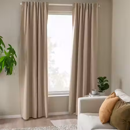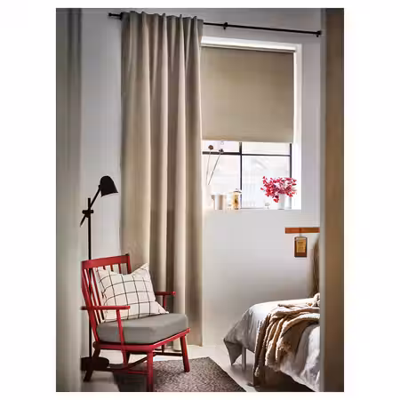 Затемняющая гардина РОСЕНМЭНДЕЛ из бежево-желтой ткани, похожей на шерсть, с меланжевой расцветкой создает спокойную обстановку в гостиной или спальне и не выглядит слишком тяжелой.