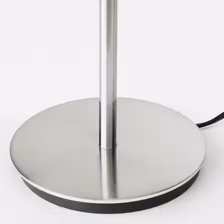 Эта невысокая настольная лампа с лаконичным дизайном, никелированным основанием и белым абажуром, сквозь который струится мягкий свет, создает уютную атмосферу в комнате.