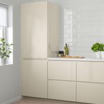 Можно дополнить глянцевыми светло-бежевыми накладными панелями, цоколями и декоративными карнизами ВОКСТОРП.