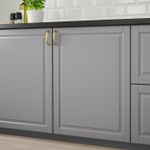 Серая дверца БУДБИН с широкой рамой подчеркнет традиционный стиль вашей кухни, добавив в интерьер сдержанный изящный колорит.
