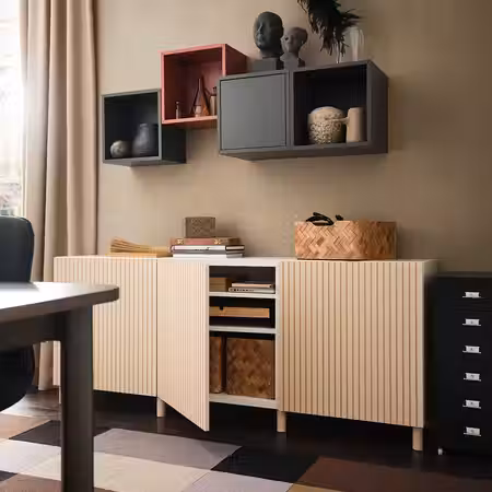 Вся мебель для хранения серии VIHALS выполнена в едином стиле, что позволяет визуально объединить интерьер столовой зоны, коридора и любых других помещений.