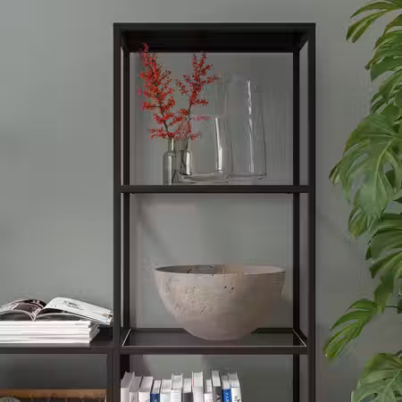 Лаконичный дизайн и стеклянные полки для демонстрации любимых вещей.