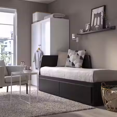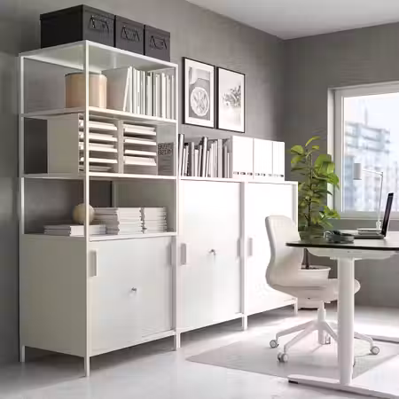 Двусторонний шкаф ТРОТТЕН с раздвижными дверцами обеспечивает доступ к вещам с обеих сторон, поэтому его особенно удобно использовать как разделитель помещения.