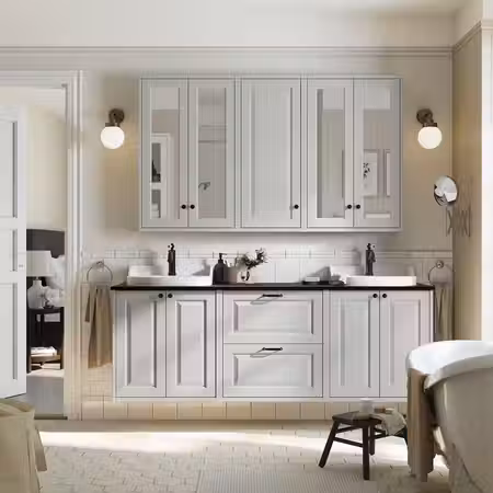 Идеальное решение для хранения самых разных вещей: более крупные предметы можно положить на полки шкафов, а всё остальное — в выдвижные ящики. В общей ванной станет намного комфортнее, если у вас будет две раковины и столешница