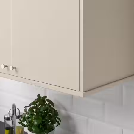 Гладкий бежевый фасад ХАВСТОРП с четкими линиями придает кухне спокойный и гармоничный облик.