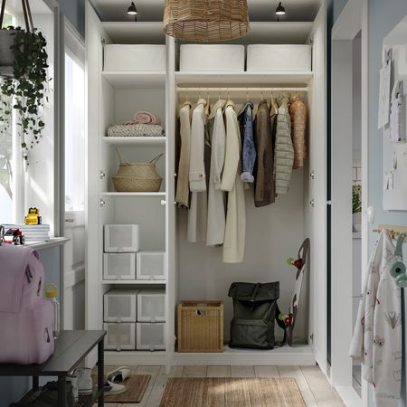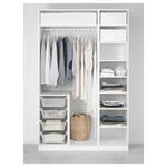 В гардеробе ПАКС вы сможете хранить много вещей на малой площади. Здесь есть платяные штанги для короткой и длинной одежды на плечиках, вентилируемые корзины, а также ящики и выдвижные полки, пространство которых можно оптимизировать с помощью