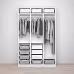 В гардеробе ПАКС вы сможете хранить много вещей на малой площади. Здесь есть платяные штанги для короткой и длинной одежды на плечиках, вентилируемые корзины, а также ящики и выдвижные полки, пространство которых можно оптимизировать с помощью