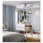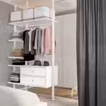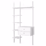 Комбинацию для хранения можно разместить вдоль стены или использовать в качестве разделителя комнаты, так как стойки крепятся к потолку.