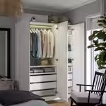 В гардеробе ПАКС вы сможете хранить много вещей на малой площади. Здесь есть платяные штанги для короткой и длинной одежды на плечиках, вентилируемые корзины, а также ящики и выдвижные полки, пространство которых можно оптимизировать с помощью
