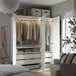 В гардеробе ПАКС вы сможете хранить много вещей на малой площади. Здесь есть платяные штанги для короткой и длинной одежды на плечиках, вентилируемые корзины, а также ящики и выдвижные полки, пространство которых можно оптимизировать с помощью