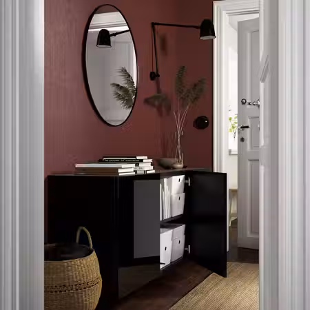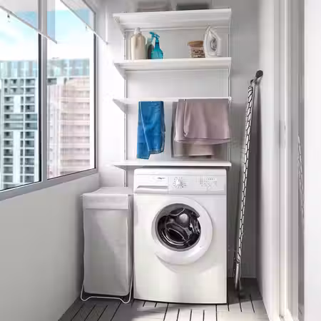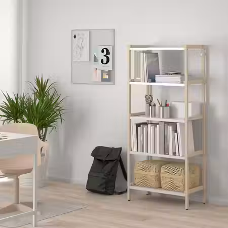 Универсальный стеллаж EKENABBEN с минималистичным дизайном позволяет видеть всё, что хранится на открытых полках, но вы можете подобрать корзины, чтобы спрятать в них всё необходимое.