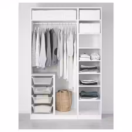В гардеробе ПАКС вы сможете хранить много вещей на малой площади. Здесь есть платяные штанги для короткой и длинной одежды на плечиках, вентилируемые корзины, а также ящики и выдвижные полки, пространство которых можно оптимизировать с помощью